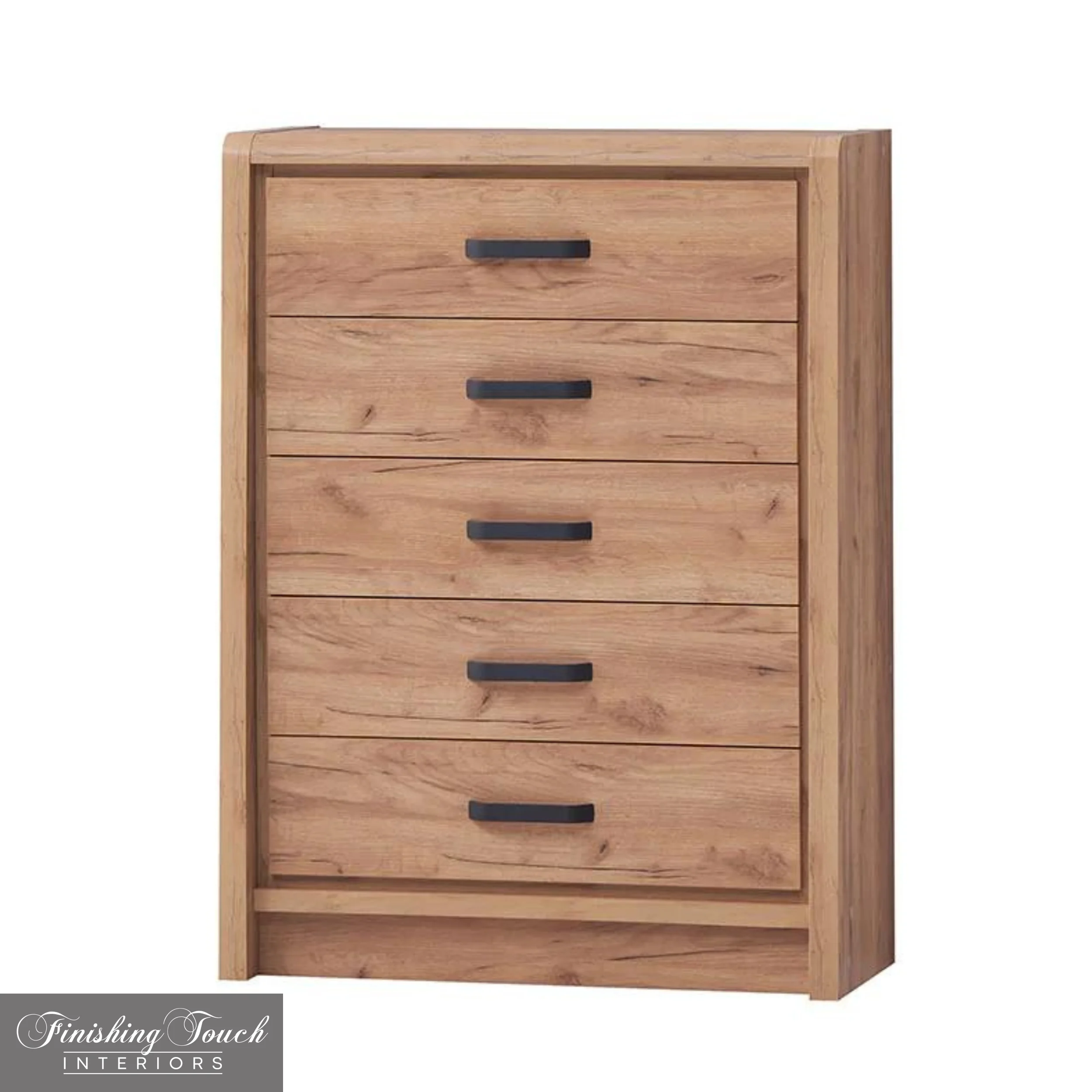The Jack Bedroom Series is finished in contemporary oak with sleek black handles. The heavy side panels are angled outwards towards the floor and have a softly rounded profile on the tops.