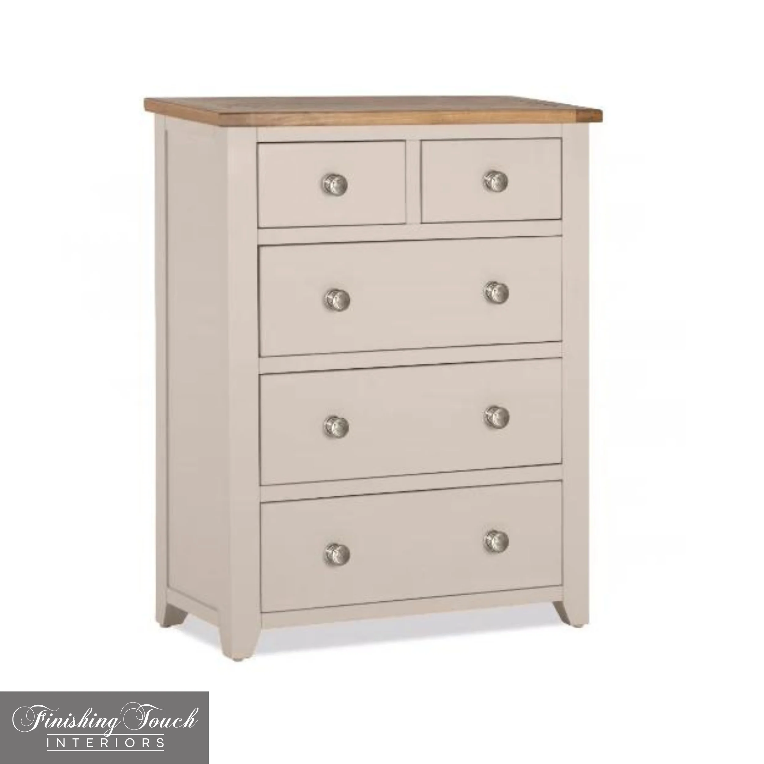 The Kylie 5 Drawer Chest will certainly complement any space, finished with a subtle grey to suit any interior setting.